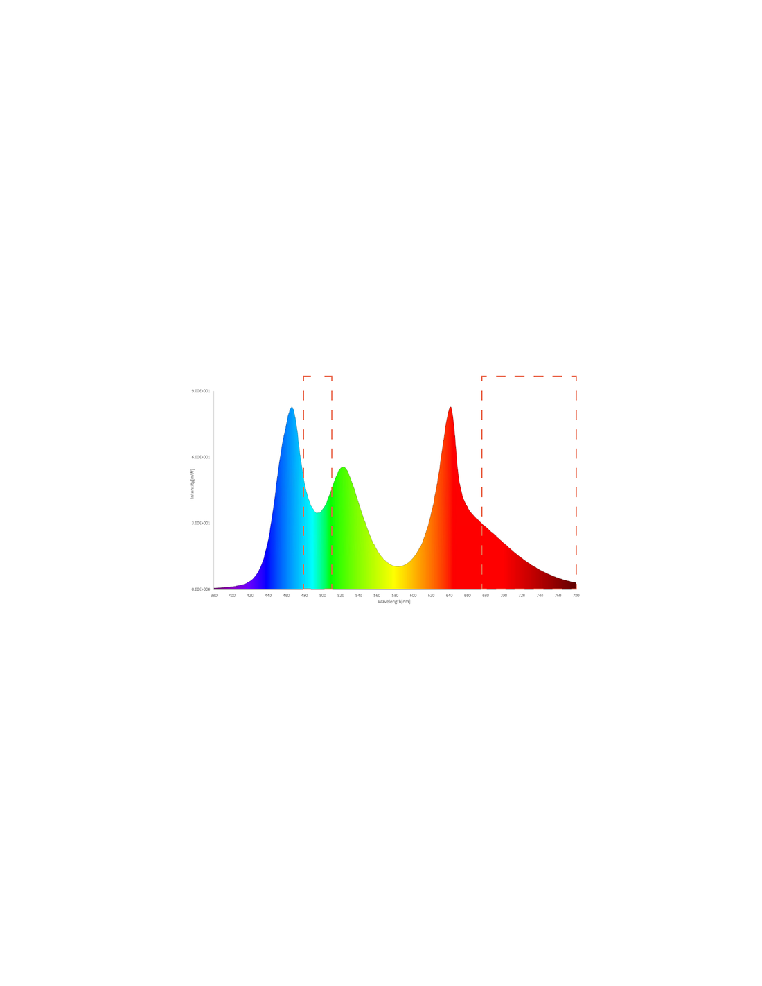 Le spectre couvre 400 à 780 nm, avec un équilibre précis sur chaque zone clé :