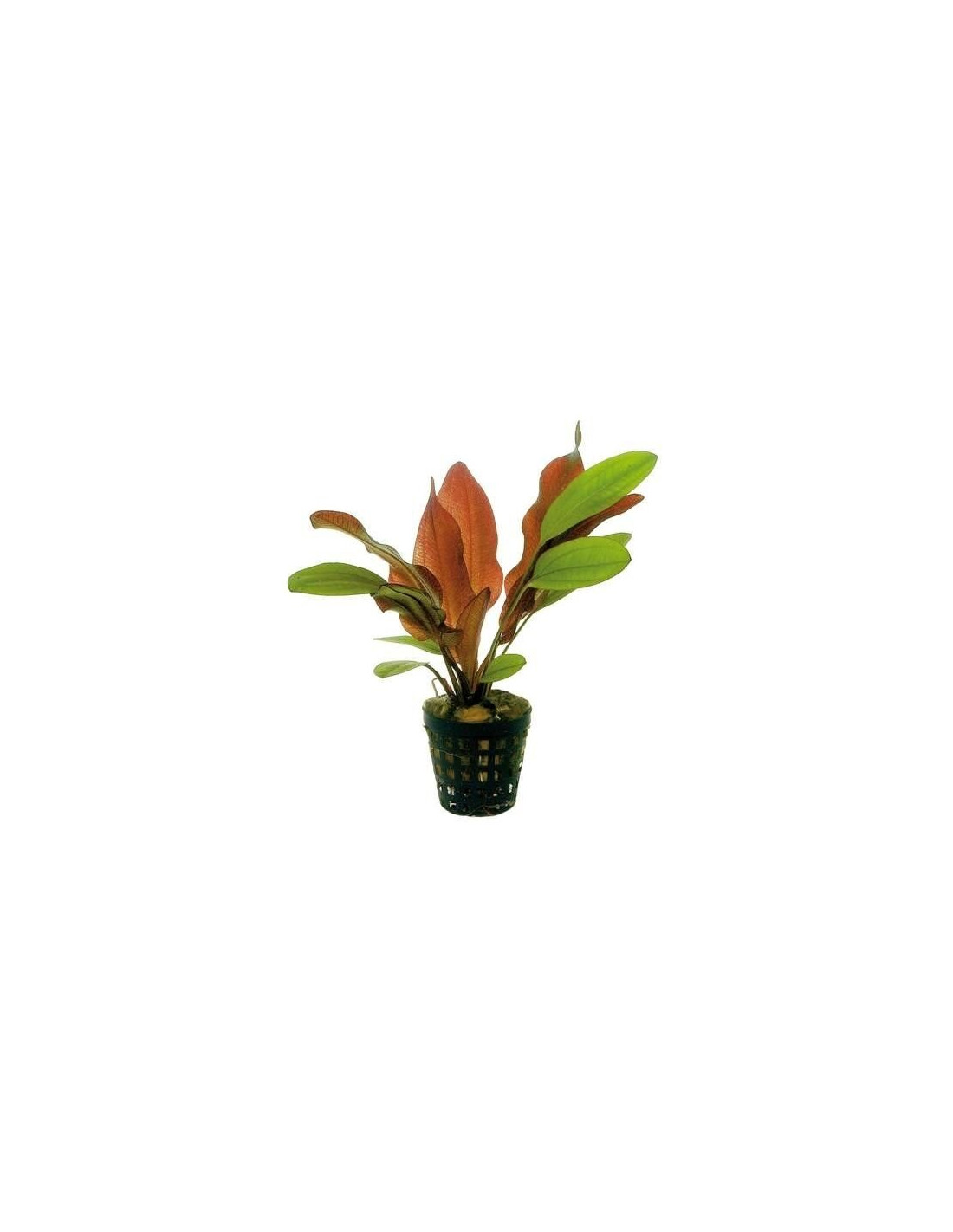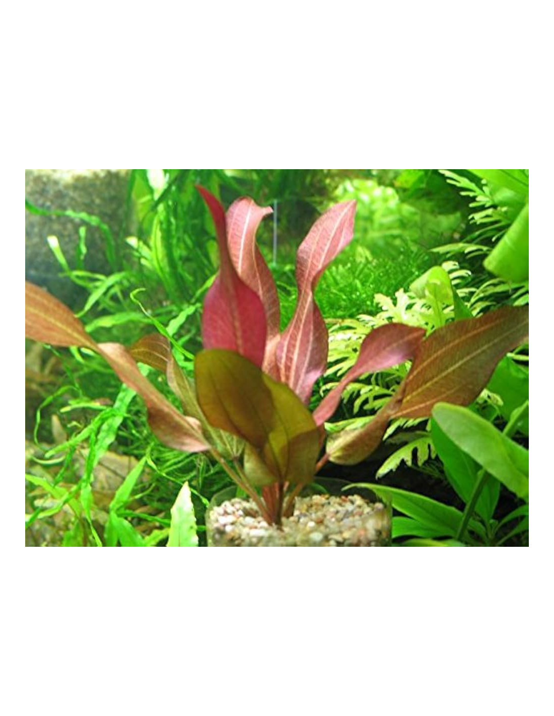 Echinodorus 'Red Flame' est prisée pour ses feuilles larges rougeâtres marbrées de taches sombres.