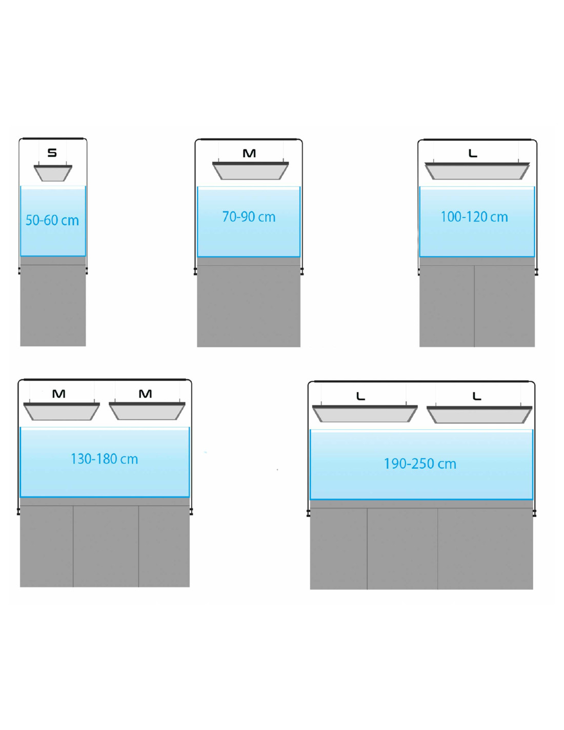 Les versions FS, FM et FL sont conçues pour des aquariums de différentes largeurs, permettant ainsi d'adapter facilement l'éclairage aux besoins esthétiques de votre aquarium .