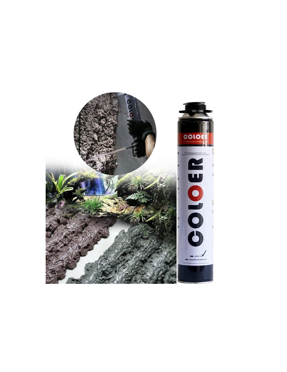 Mousse expansive brune spécialement formulée pour l’aquascaping et la création de décors naturels.