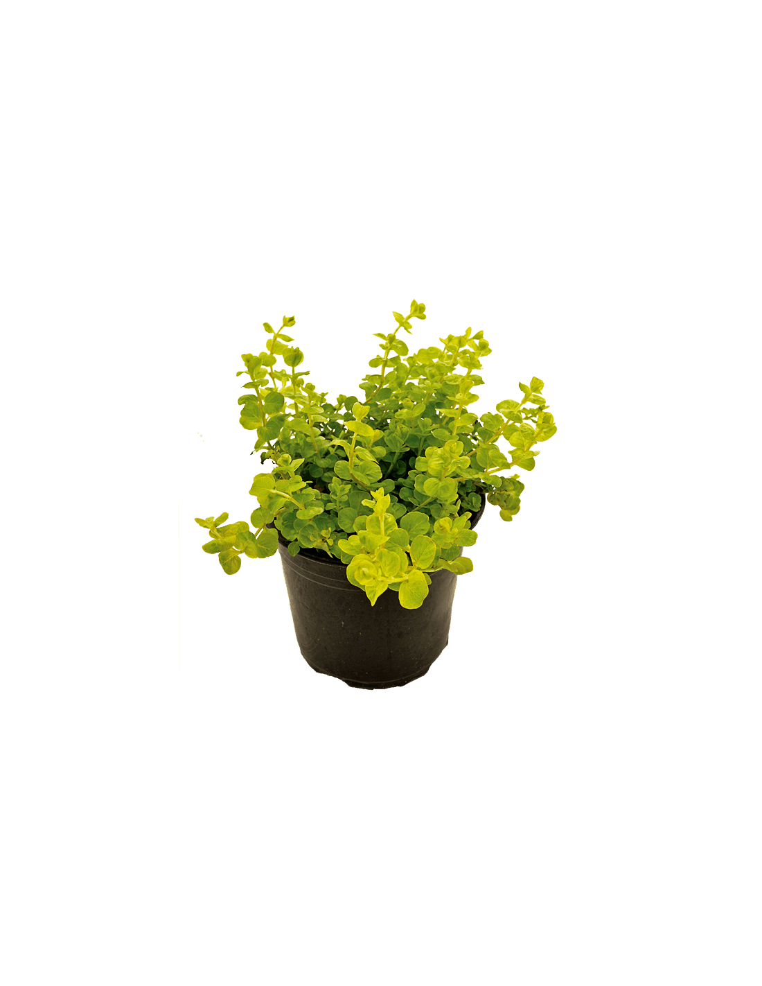 Feuilles : Petites, rondes et lisses, disposées serrées le long des tiges rampantes. Couleur jaune vif à jaune‑vert selon l’éclairage.